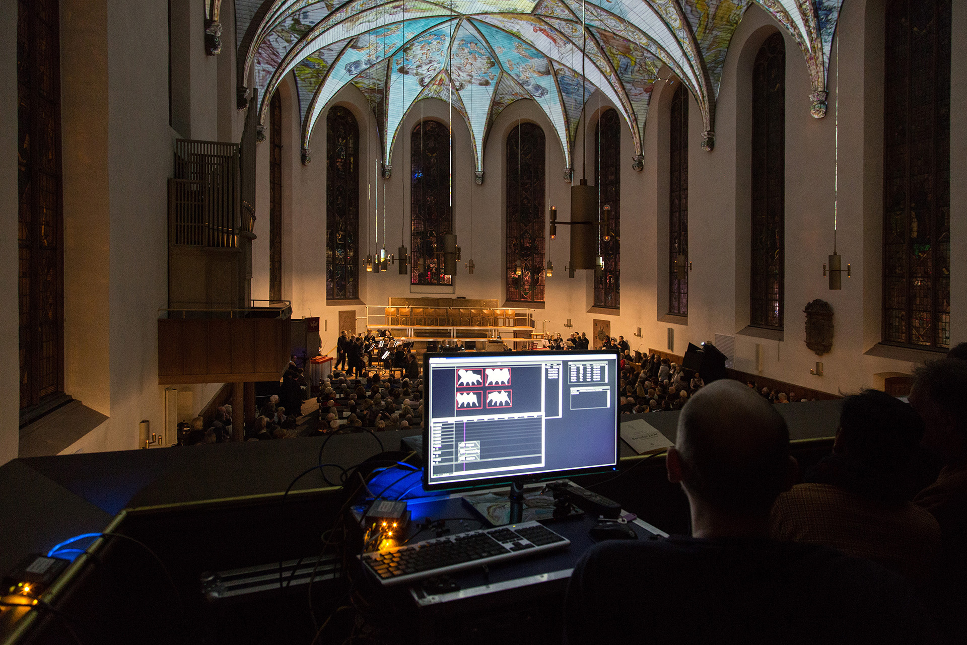Die technische Umsetzung wurde mit 4 Panasonic DZ21 Projektoren und einem „Watchout“ Medienserver realisiert.